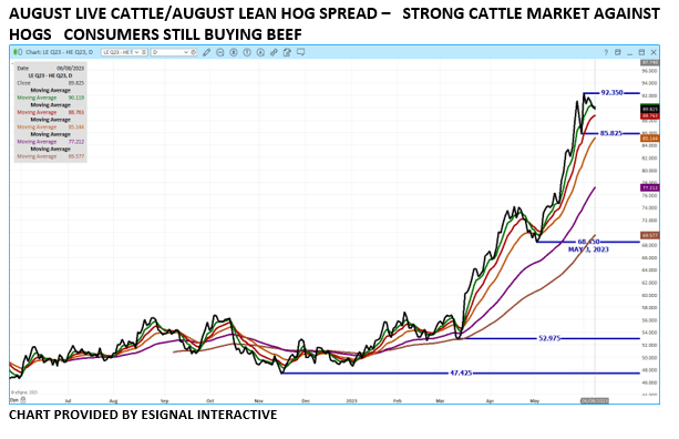Thursday Live Cattle trade volume was moderately active.  Has a top been put in cattle? The reality of the cattle market is packers are fighting over the few showlist cattle but the majority of cattle moved on various forms of contracts, fed directly for a packer feeding program or outright owned by a packer.  Day after day boxed beef prices are skyrocketing lead by Choice primal rib primals simply because the amount of Choice rib primals are scarce but so are other primal sections.