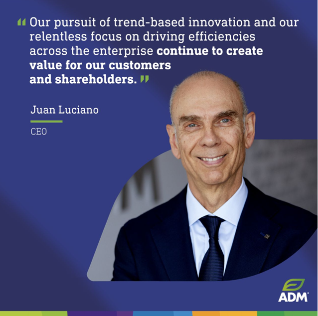 “Through our second quarter results, ADM has once again shown that the diversity of our business portfolio and our integrated value chain have enabled our team to consistently deliver excellent results, even in very dynamic market conditions. Our pursuit of trend-based innovation and our relentless focus on driving efficiencies across the enterprise continue to create value for our customers and shareholders,” said Chairman and CEO Juan Luciano.