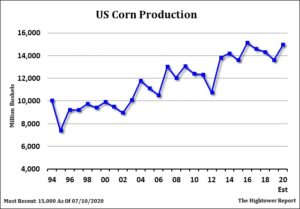 Corn traded slightly higher. Corn managed small gains due to fact prices may be oversold. Yesterday, Managed funds were big sellers of corn futures with open interest going up. This could suggest new short positions at contract lows. Corn futures tend to make lows in September. This week USDA suggested that most of the crop was silking and ahead of average. This could suggest an early harvest. Central Midwest could see warmer temps this weekend. Next week the central Midwest could see normal rains. Food and Ag Commodity Economics estimated US 2020 corn crop near 15,036 mil bu versus USDA 15,000 and Stones estimate of 15,320. They also estimated World 2020 crop near 1,159 mmt versus USDA 1,163. There is still concern that final US crop will be larger and increase the carryout over USDA 2,648. Weekly US ethanol production was down from last week and last year. Stocks were unchanged from last week but down from last year. Margins are a little negative. Deferred margins are negative. Margins turn negative if CZ trades over 3.30. Weekly US old crop export sales are estimated near 100-600 mt versus -29 last week and new crop 2,000-2,600 mt versus 638 last week.
