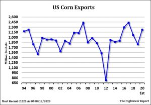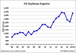 Corn futures traded higher and closed near session highs. Uncertainty over the size of the US 2020 corn crop triggered fund short covering. Combination of dry weather across the Midwest and last week’s strong winds may have taken the top off the US record corn yield. Pro Farmer Annual tour is the week. Participants in SD estimated the corn yield near 184.6 versus the trip average last year near 152.8. USDA August guess was 167.0. OH tour yield was 170 versus USDA August guess of 175. Tour will announce todays numbers in a report tonight. Tour will be in NE and IN tomorrow. Trade expected USDA to drop Weekly US corn crop rating to 68 pct good/ex versus 71 last week. There are a range of ides of US corn losses due to heavy winds from 300-1,200 mil bu. Weekly US corn exports were near 41 mil bu versus 20 last year. Season to date exports are near 1,587 versus 1,817 last year. USDA goal is 1,795 versus 2,066 last year. USDA estimates 2020/21 US corn exports near 2,225. Sep corn futures is near 100 day moving average. Resistance is near 3.40. Farmers should increase 2020 cash sales above 3.50 CZ.