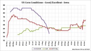 Corn futures traded lower. Corn found support recently due to talk of lower US 2020 crop. Damaging Wind storm with straight line winds in excess of 100 mph knocked down portions of the Iowa record corn crop. Farmers and agronomist are all trying to figure just how many bushels Iowa loss due to the storm. Most estimate 200-300 mil bu. Pro Farmer crop tour will survey West Iowa on Wednesday and the rest of Iowa on Thursday. USDA said they will resurvey Iowa farmers 2020 acres for the September report. USDA dropped Iowa corn crop rating this week 10 pct to 59 pct good/ex. Pro Farmer tour participant estimated SD 2020 corn yield near a record 179.2 versus their estimate last year of 142.0 and USDA August guess of 167.0. Pro Farmer tour participant estimated OH 2020 corn yield near 167.7 versus their estimate last year of 140.8 and USDA August guess of 175.0. OH is the lowest key Midwest rated corn state. Tour will survey IN and NE today. One crop watcher estimated US corn yield still near 180.0. This was below USDA August guess but still above trend. They did drop corn acres 500 thousand from USDA. USDA announced 195 mt US 2020/21 corn sold to China and 130 mt US 2020/21 corn sold to unknown. This should bring China US total to 6 mmt.