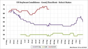 Soybean market continues to trade with news both positive and negative. Fact USDA dropped weekly US soybean crop rating plus another day in which USDA announced another US soybean sale to China offered support. Fact weekly US soybean exports were lower than expected and Pro Farmer SD and OH soybean pod count was higher than last year and average weighed on prices. Key will be US weather next week. Overnight American and Canadian weather models hinted of increases chances for rains next week across a broad area of the US Midwest. Europe model was drier. Noon American model is not as wet. Higher Malaysian palmoil prices helped soyoil gain on soymeal. Price Bears still feel soybean and soymeal futures will trend lower into the fall US harvest. Managed funds were small net sellers of soybean and soymeal and buyers of soyoil. This week funds have added to their net soybean and soyoil long and reduced their soymeal short. Some also felt lower soybean traded today could be due to an overbought technical position.