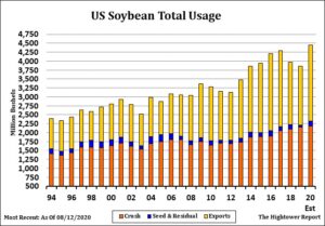 Soybean closed unchanged. Trade is still trying to figure out US final 2020 supplies. US crop ratings are still above average. This weeks Pro Farmer tour continues to report pod count above last year and average. The tour will survey critical crops in IL and IA today. Most feel US crop needs a good rain to sustain high yield potential. Weather maps hint of rain next week. Dry weather is forecasted until then. Some feel it may be hard to sustain breaks and rallies in prices until more is known about final US soybean crop size. USDA announced 192 mt US soybean were sold to China for next market year. Weekly US old crop soybean export sales is estimated near 300-800 mt versus 570 last week. New crop is estimated near 2,000-3,000 mt versus 2,839 last week. US domestic soybean basis continues to slip lower. Most look for Nov soybeans to keep in a 8.75-9.25 range.