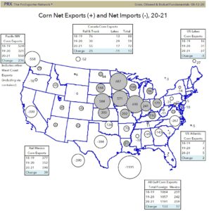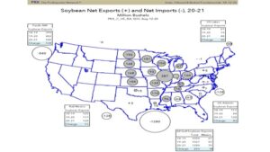 Corn futures traded higher. From a low near 3.20 on Aug 12 Dec corn traded up to near 3.46 on August 18. The market made new lows in front of what many thought would be a bearish USDA August crop report. The report was bearish but a bad windstorm flattened part of the record Iowa corn crop. Funds then covered their shorts given talk of big potential losses. This week’s Pro Farmer crop tour found corn yield near USDA August guess except for Nebraska and Iowa. After the close, Pro farmer estimated US 2020 corn crop near 14,820 mil bu or a 177.5 yield. USDA August guess was a 15,278 and 181.8 yield. In September USDA will resurvey farmers and also have a special survey for Iowa acres. Also in September USDA will use for the first time actual field data. USDA estimates that US 2020/21 corn exports will be 31 pct of total World trade. In 1979, US share was 84 pct. USDA is estimate World 2020/211 corn trade near a record 184 mmt. Normal end to US summer weather should pressure futures lower. USDA is estimating a 60 mmt increase in World 2020 corn crop production, 43 from US and 8 from Brazil. Chart below shows Pro Exporters map of US cash corn moment from the excess states to demand. Key to cash prices is demand and logistics it takes to move grain.