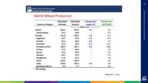Soybeans traded higher and closed near session highs. USDA September soybean numbers were in line with traded guesses but below their August guess. Talk of increase China buying and positive tech signals increased speculative buying. US farmers were good sellers on todays rally. USDA estimated US 2020 soybean crop near 4,313 mil bu versus 4,295 expected and 4,425 last month. Iowa wind storm reduced US crop 150 mil bu. USDA left US total 2020/21demand near 4,442 mil bu versus 3,903 last year. Carryout is now 460 versus 575 last year. USDA lowered World soybean end stocks to 93.5 mmt due to lower US crop. The raised Brazil 2 mmt to 133.0. They left China soybean imports at 99.0 mmt. Weekly US soybean export sales were near 116 mil bu. Total commit is near 1,098 mil bu versus 347 last year. USDA goal is 2,125 mil bu versus 1,680 last year. Managed funds were buyers of 10,000 soybeans, 3,000 soyoil and 5,000 soymeal. Managed funds are net long 197,000 soybeans, 29,000 soymeal and 84,000 soyoil.