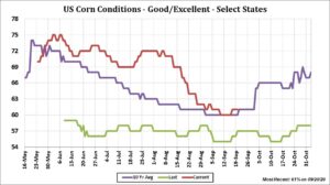 Corn futures traded lower. Corn futures were supported by the lack of US farmer selling and more US corn sales to China offered support. Talk of lower US crop size also is offering support. Approaching US corn harvest could offer seasonal resistance. USDA announced 140 mt US corn to China and 320 mt of US corn to unknown. The forecast of good US Midwest harvest weather could be offering resistance to corn futures. Weekly US ethanol production could be down slightly from last week Stocks could also be down slightly. This could be due to regular seasonal maintenance. There is still concern that demand may not increase with US consumers driving less miles. USDA estimated US corn crop is 61 pct good/ex versus 60 last week. USDA estimated US corn harvest near 8 pct done. One crop watcher is still estimating US corn yield near 176.0 versus USDA 178.5. One group estimates Brazil 2021 corn acres near 48.4 million versus 45.4 in 2020 and production 110 mmt versus 102 in 2020. Argentina 2021 corn acres near 15.3 million versus 15.3 in 2020 and production 50 mmt versus 50.