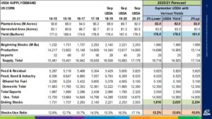 Wheat futures trade sharply higher after USDA estimated US Sep 1 corn, soybean and wheat stocks lower than expected. WZ was up 28 cents. WZ range was 5.47-5.87. Most were looking for WZ to remain in a 5.30-5.70 range. Dry weather in Russia and US south plains offers support. Large global wheat supplies and slowdown in World trade due to Covid was offering resistance. KWZ closed up 33 cent. KWZ range was 4.75-5.15. Most were looking for KWZ range was 4.60-4.90. USDA estimated US wheat Sep 1 stocks at 2,159 mil bu versus 2,346 last year. This implies Q1 residual use near 249 mil bu versus 205 expected and 166 last year. USDA estimates total annual residual near 90. USDA also estimated US 2020 wheat crop near 1,826 mil bu versus 1,838 previous. They dropped the HRW crop 39 mil bu and SRW crop 11 mil bu and raised HRS 9. White winter was up 20 mil bu. Guesses for weekly US wheat export sales are 200-500 mt versus 351 last week.