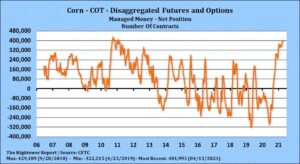 Corn futures traded higher. CK is back near contract highs. CZ made new highs. Some feel less than ideal US spring weather could add 50-75 cents to CZ. Managed funds increased their net long due to increase dryness across Brazil corn areas and concern about cold and dry weather across US north plains and west Europe. Dalian corn futures continue to trend higher. Brazil domestic corn prices are record high. Weekly US corn exports were near 60 mil bu vs 28 last year. Season to date exports are near 1,545 mil bu vs 840 last year. USDA goal is 2,675 vs 1,778 last year. Exports are running 705 mil bu above last year. USDA goal is an increase of 897. Some feel final exports could be closer to 2,900. USDA continues to refrain from increasing exports due to slow China exports. USDA feels China will roll 235 mil bu of open corn sales to new crop. Commercials feel China will take the corn. Corn futures are not yet trading higher US domestic basis or US summer weather. World climate summit this week could result in higher US green fuel which could increase corn biofuel use. Trade est US corn planting near 9 pct vs 4 last week. Weekly US sorghum exports were 12 mil bu. Season to date is near 204 mil vs 85 ly.