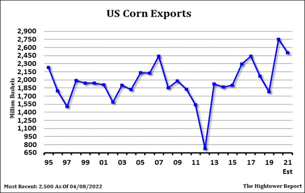 Corn futures ended slightly higher. CN ended near 8.13 with a range near 8.08 to 8.19. July corn has been straight up since the low of 5.12 in Sep,21. Higher ethanol use and strong exports offset a record US 2021 corn yield. Ukraine war and lower South America supplies has helped futures push to new highs. Concern that US 2022 corn crop may be planted late also offered support. Some feel Midwest corn planted after May 10 could see a yield drag from trend. Talk of increase Iowa farmer plantings offered resistance. Despite US Dollar at 20 year highs and corn near all-time highs, US ethanol margins have turned positive which is helping the basis. US corn export sales were 61 mil bu. Total commit is near 2,264 vs 2,666 ly. USDA announce new corn sales to China. Some feel they will continue to buy US corn. USDA US corn export goal is 2,500 versus 2,753 ly. Some feel final exports could reach 2,700 which would drop US 2021/22 carryout to 1,200 vs USDA 1,440. Corn futures also supported by rebound in Crude oil futures.