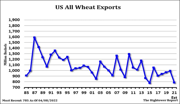 Soybeans ended lower. Talk of slower China buying US soybeans offered resistance. Tighter World vegoil supplies and higher rapeseed oil and sunoil prices continues to help soyoil gain on soymeal. Some doubt prospects of lower soyoil prices until late 2022 if World canola supplies rebound or 2023 if South America soybean supplies increases. Overnight Dalian soybean, soymeal, soyoil, RSO were higher. Malaysian palmoil was lower. New crop Matif rapeseed futures were higher. Lower Brazil soybean export prices offered resistance to soybean futures. Weekly US soybean export sales were 17 mil bu. Total commit is near 2,115 versus 2,245 ly. USDA goal is 2,115 vs 2,261 ly. Next Key USDA report is May 12 and USDA first US/World 2022/23 Supply and Demand.
