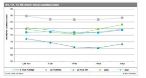 Wheat futures closed mixed. USDA announced 130 mt US wheat to unknown. Some feel this could be China annual buying of US SRW. Today USDA will release their first US winter wheat crop rating by state. Informa today estimated US 2021 all wheat crop near 1,946 mil bu vs 1,826 last year. Informa estimated US 2021 winter wheat crop near 1,316 mil bu versus 1,171 last year. HRW crop is est near 739 mil bu vs 659 ly. SRW crop is est near 340 mil bu vs 266 last year. Informa also estimated World 2021 wheat crop near 788 mmt vs 777 last year. Russia 69 vs 63 ly. Weekly US wheat exports were near 22 mil bu vs 12 ly. Season to date exports are near 768 mil bu vs 765 ly. USDA goal including flour is 985 vs 965 ly. Some est KC futures to range from 6.00-7.00 between now and July. Chicago wheat futures could range from 6.00-7.25. Minn wheat futures could range from 6.50-7.50.