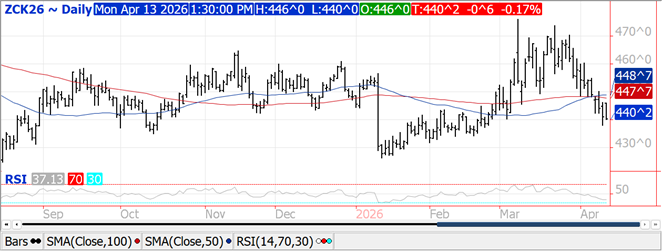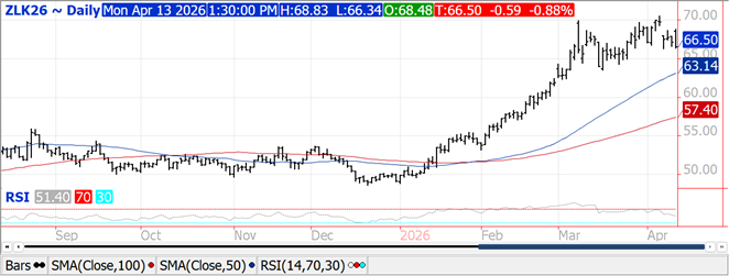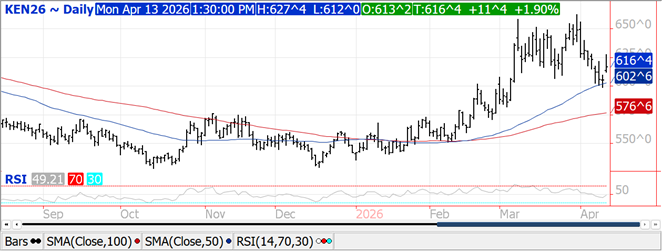 Prices turned mostly lower at midday with beans and soybean oil making new lows at the close. Beans were off $.07-$.14, bean oil was down 65 points while meal was steady. May-26 beans rejected trade into fresh 4-week highs overnight. Support is at the 50-day MA at $11.55 ¼. Support for May-26 oil is at LW’s low of 66.22. May-26 meal traded to a fresh 5-month high before backing up. Spot board crush margins are jumped another $.09 to $2.99 bu., the highest since Oct-22, while meal and oil PV’s both sit at 50%. Friday’s CFTC report showed MM’s were net buyers of 15k contracts of soybean oil extending their record long position to nearly 151k contracts. MM’s were net sellers of 24k contracts of soybeans and just over 6k contracts of meal. While energy/war headlines will drive price volatility, the markets attention will gradually shift toward the US planting season and Pres. Trump’s upcoming trip to China. The US blockade of the Straits of Hormuz along with Chinese weapons sales to Iran will complicate negotiations or potentially threaten the trip entirely. Conab is expected to raise their Brazilian production forecast 1 mmt to 179 mmt, still just below the USDA forecast of 180 mmt. Export inspections at 30 mil. bu. were in line with expectations. YTD inspections at 1.158 bil. are down 25% from YA vs. the revised USDA forecast of down 18%. China took nearly 13 mil. bu. while Egypt took 8 mil.