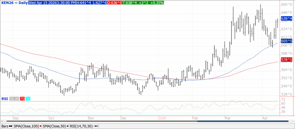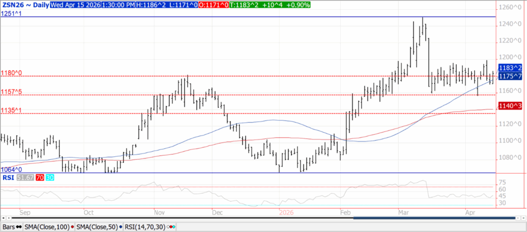 Prices were moderately higher across the complex with beans up $.09-$.11, meal was $2-$5 higher while oil was up over $.01 lb. Spreads were mixed in soybeans while firmer in the products. Spot crush margins surged another $.14 to $3.12 bu., a fresh 3 ½ year high, while bean oil PV improved to 50.3%. NOPA crush at 226 mil. bu. was below the Ave. estimate of 230 mil. however, within the range of est. Processing was well above the 209 mil. bu. in Feb-26 and the 194.5 in Mch-25 however failed to reach the all-time high of 227.65 in Oct-25. Implied census crush at 231 mil. bu. would bring YTD to total to 1.565 bil. bu., up 9% from YA vs. the revised USDA forecast of up 7%. To reach the current USDA est. of 2.610 bil. bu. crush over the last 5 months of the MY will need to reach 207 mil. bu., up 4% from YA. Bean oil stocks at only 2.04 bil. lbs. were below expectations of 2.173 while falling from 208.8 the previous month. Tomorrow’s export sales are expected to range from 8-22 mil. bu. of soybeans, 300-600k tons of meal and -10 – 14k tons of oil.