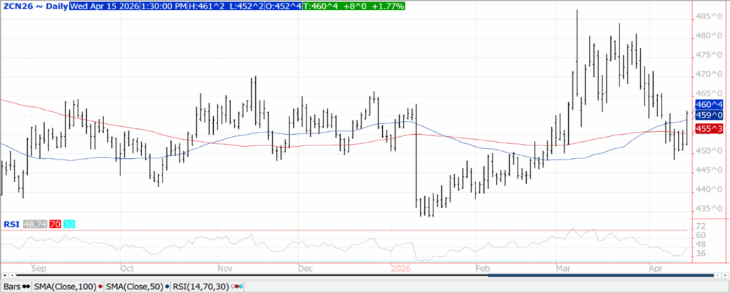Prices were $.08 higher finishing near session highs while spreads were mixed. July-26 recently rejected trade below $4.50 while today closing above its 50-day MA. Despite the big discrepancy between the USDA and SA production forecasts, US FOB offers remain competitive into the summer months. Expectations for tomorrow’s export sales are 32-70 mil. bu. Plantings in the SE half of the Midwest are moving along at a rapid pace while not at all in the soaked N. Midwest. Ethanol production rose to 1,120 tbd, or 329 mil. gallons in the week ended April 10th, up from 328 mil. the previous week and 10.7% above YA. Production was above expectations. There was 110 mil. bu. used in the production process, or 15.78 mil. bu. per day, above the 15.4 pace needed to reach the USDA forecast of 5.60 bil. bu. In the MY to date there has been 3.40 bil. bu. used, or 15.3 mbd, an annualized pace of 5.590 bil. Ethanol stocks jumped to 26.7 mil. barrels, above expectations while matching YA.