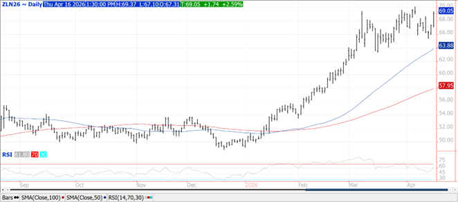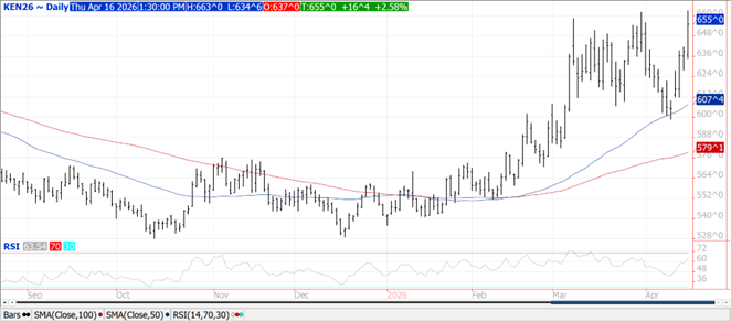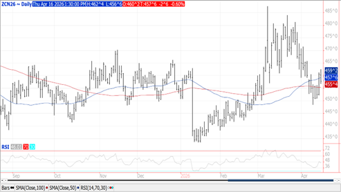 Prices pulled back late settling $.01-$.03 lower. Spreads also weakened. July-26 closed back below its 50-day MA with next support at the 100-day MA at $4.55 ½. Dec-26 was down $.01 ¼ at $4.76 ¾. Plantings in the SE half of the Midwest are moving along at a rapid pace while little activity in the soaked northern Midwest. Yesterday’s ethanol production at 329 mil. gallons was above expectations as processing margins remain robust. While speculative traders were healthy buyers of nearly 18k contracts yesterday, O.I. in corn fell by just over 10k. Export sales at 57 mil. bu. were in line with expectations and brought old crop commitments to 2.866 bil. bu. up 29% from YA, vs. the USDA forecast of up 15.5%. Commitments represent 87% of the USDA forecast, above the historical average of 83%. Noted buyers were Japan–16 mil., Korea–13 mil. and Mexico–7 mil. The BAGE raised their Argentine production forecast 4 mmt to 61 mmt, well above the USDA est. of 52 mmt, however still below the Rosario Grain Exchange est. of 67 mmt.