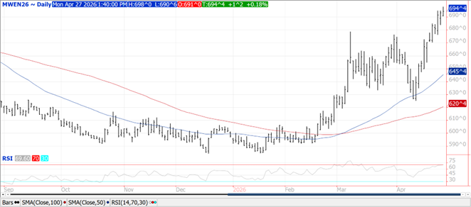 Prices ranged from $.02-$.13 higher. CGO July-26 was up $.13 at $6.29 ¾, KC July-26 was $.05 ½ higher at $6.75 ¼, while MIAX July-26 was up $.01 ¼ at $6.94 ½ reaching a 10 month high in the process. Money managers bought 11k contracts of KC wheat extending their long position to 28k contracts, the largest since June-22. Ukrainian drones caused damage to a Russian fertilizer plant and oil refinery this weekend. Egypt’s Agricultural Ministry indicates they have purchased 363k mt of wheat from local farmers so far in the 26/27 MY that began at the beginning of April-26. Saudi Arabia is believed to have purchased 985k mt of wheat for June-Aug shipment. Prices range from $273-$285/mt CF with most of it likely sourced from the Black Sea region. I look for WW ratings to slip another 1-2% down from 30% G/E LW while spring wheat plantings are expected to have reached 24-25%. US export inspections at 13 mil. bu. were in line with expectations. YTD inspections at 803 mil. bu. are up 12% YOY vs. the USDA forecast up 9%.