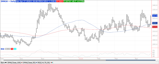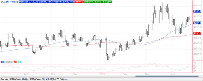 Prices were $.05-$.06 higher while spreads firmed a bit. Dec-26 traded to a new high for the month while July-26 reached a 3 ½ week high. July-26 remains rangebound between $4.50-$4.80. Widespread rains across the US midsection will slow planting progress this week. The US House Committee on Rules is expected to hear legislation this week on a bill that would allow, but not require, fuel retailers to offer E-15 year-round. Farmers and ethanol manufacturers support the measure while gasoline refineries oppose it citing added compliance costs. Brazil is moving forward with plans to raise their ethanol blend in gasoline 2% to 32%. I expect this afternoon’s crop update to show US corn planting to land between 20-22% through yesterday. Export inspections at 65 mil. bu. were in line with expectations and above the 62 mil. bu. needed per week to reach the USDA forecast. YTD inspections at 2.104 bil. are up 31% from YA vs. the USDA up 16%. Noted buyers were Mexico–14 mil. while Japan, S. Korea and Colombia all bought between 7.5-8.5 mil. bu.