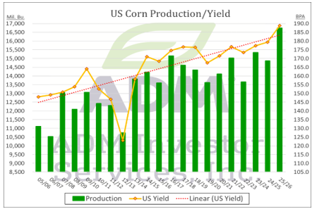 Prices ranged from slightly lower in MIAX futures to $.10 lower in CGO. New contract low for Sept-25 CGO however managed to hold above the $5.00 level. All US wheat production fell 2 mil. to 1.927 bil. bu. slightly above expectations. The Ave. yield at 52.7 bpa matches the record high from 2016. Winter wheat production increased 10 mil. to 1.355 bil. roughly 10 mil. above expectations. HRW production was up 14 mil. to 769 mil., SRW up 2 mil. to 339 mil. while white was down 7 mil. Spring wheat production was down 20 mil. to 484 mil. while durum was up 7 mil. to 87 mil. bu. Demand rose 20 mil. with exports up 25 mil. and food usage down 5 mil. The increased exports was all for the HRW futures (KC) more than offsetting the higher production enabling stocks to slip 15 mil. to 416 mil. All wheat ending stocks were cut 21 mil. to 869 mil. nearly 15 mil. below expectations however still a 6 year high. The 2025/26 Ave. farm price fell $.10 to $5.30 bu. World stocks were down 1.5 mmt to 260 mmt, at the low end of expectations. Chinese wheat production fell 2 mmt to 140 mmt which was offset by a 2 mmt reduction in their domestic feed usage.