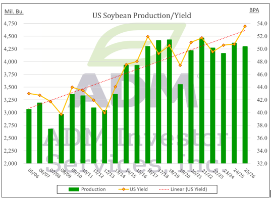 The USDA lowered old crop 24/25 ending stocks 35 mil. to 1.305 bil. slightly below expectations. Exports for 24/25 were raised another 70 mil. bu. to 2.820 bil. Usage for ethanol production was cut 30 mil. bu. with other FSI usage down 5 mil. The 2025 harvested acres were revised up nearly 2 mil. to 88.69 mil. while the Ave. US yield rose 7.8 bpa to record 188.8 bpa. Production up nearly 1 bil. bu. to record 16.742 bil. roughly 750 mil. above expectations. The increase in production and yield was the largest ever in the August report. The previous biggest change came in 2016 when production rose 613 mil. bu. with the Ave. yield rising 7.1 bpa. New crop 25/26 demand rose 545 mil. bu. to nearly 16 bil. US ending stocks rose to 2.117 bil. bu. which if verified would be a 7 year high and 215 mil. above expectations. Stocks/use at 13.3% is a 6 year high. These optimistic usage figures will have to prove themselves over the course of the MY. The Ave. US farm price for 2025/26 was cut $.30 a bu. to $3.90. Global stocks were up 10.5 mmt to 282.5 mmt due only to the higher US inventories, otherwise minimal change in the global S/D’s. Surprised to see Brazil’s 24/25 production left unchanged at 132 mmt. Chinese 24/25 stocks down 1 mmt on lower imports. Next support for spot Sept-25 is $3.60 ½, the low from last August on the weekly chart.