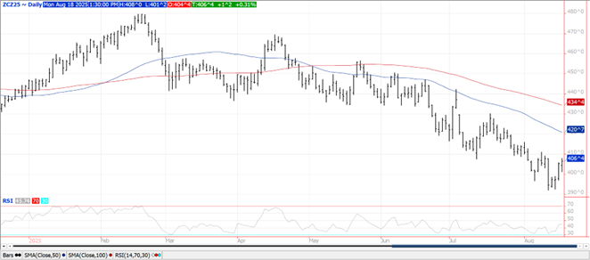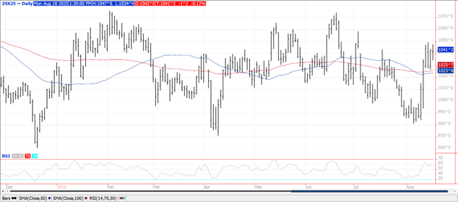 Prices ranged from $.01 lower to $.02 higher today in two-sided trade. Spreads also weakened. Near-term resistance for Dec-25 rests at $4.11. Reports from the ProFarmer crop tour show strong yield potential in SD on the western leg of the tour, while dry conditions in IN/OH along with some reporting pollination issues from the midsummer heat are being reported in the east. Export inspections at 41 mil. bu., were at the low end of expectations and below the 53 mil. bu. needed to reach the revised USDA forecast of 2.820 bil. bu. YTD inspections at 2.528 bil. are up 28% from YA vs. the USDA forecast of up 25%. The USDA also announced the sale of 124k mt (5 mil. bu.) to an unknown buyer. Money managers were net sellers of only 2,364 contracts in the week ended Tues. Aug. 12th extending their short position to 176k, much less than expectations of nearly 200k. AgRural reports Brazil’s 2nd crop 24/25 harvest has reached 94% as of last Thursday, while planting progress for the 2025/26 crop reach nearly 2%.