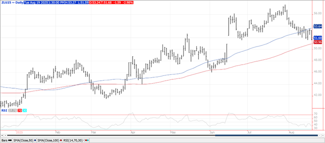 Prices were mostly lower across the complex with beans down $.06-$.08, meal rallied late closing $6-$8 higher, while oil was down $.01 ½ per lb. Bean and oil spreads eased while meal spreads rallied. Nov-25 beans continue to consolidate between LW’s high at $10.49 ¼ and its 100 day MA support at $10.26. Next support for Sep-25 oil is the 100 day MA just below $.51 lbs. Next resistance for Sept-25 meal is the 100 day MA at $291. Spot board crush margins firmed $.06 to $1.88 bu. with bean oil PV slipping to a 2 month low at 47.3%. News that the USDA will no longer support solar and wind projects on production farmland stooked fears the Trump Administration may not be as supportive of green diesel as initially believed. The EPA’s final ruling on small refinery exceptions (SRE) isn’t expected until Oct. 31st. China’s purchase of canola from Australia for the first time in 5 years also contributing to the bearish sentiment. Crop conditions held steady at 68% G/E. Overall ratings remain the highest since 2020. Updated acres and conditions would suggest and average yield at 53.6 bpa and production of 4.295 bil. very much in line with the USDA forecast of 4.292 bil. 82% of the crop is setting pods, in line with recent history. Pods counts in both SD and OH were above both YA and their 3-year Ave. The USDA announced the sale of 228.6k mt (10 mil. bu.) of soybeans to Mexico. EU soybean imports for the 25/26 MY as of Aug. 17th at 1.74 mmt are down 6.5% from YA. Their meal imports at 2.44 mmt are also off 6.5% YOY. Reports today from NE show pod counts down significantly from YA. Since 2000 record soybean yields have been set only 6 times and not since 2016. Every year the highest yield was posted in either November or final.