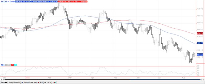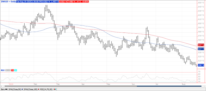 Prices ranged from $.01 higher in MIAX futures to $.07 lower in KC. New contracts lows across the board for the Sept-25 contracts. Spot CGO dipped below $5.00 and to its lowest level in nearly a year for the spot contracts. Spot KC also dipped under $5.00 however held support above its Spring low. Accommodations for a peace meeting between Putin and Zelenskiy appear to be in the works. In addition, a White House spokesperson stated Pres. Trump has directed his national security team to work with the EU in helping coordinate security guarantees for Ukraine. Spring wheat conditions improved 1% to 50% G/E, in line with expectations. Overall ratings are below YA and now slightly above the 5-year Ave. Harvest advanced 20% to 36% complete matching the 5-year Ave. however well above expectations. Winter wheat harvest advanced 4% to 94% complete. EU soft wheat exports at only 1.78 mmt as of Aug. 17th are less than half of YA. Jordan reportedly passed on their recent tender for 120k mt of wheat.