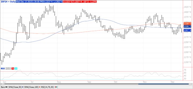 Prices were sharply lower across all 3 classes as the day to day choppiness continues.   Chicago and MGEX were down $.15 – $.20, while KC plunged $.22 – $.25.  Mch-24 Chicago closed below yesterday’s low, however held above the 50 day MA support at $6.00 ¼.  Mch-24 KC briefly traded below this week’s low of $6.30 ¼.  Algeria reportedly bought over 900k mt of milling wheat at around $273/mt CF, likely sourced from the Black Sea region for Feb/Mch-24 shipment.  Since July 1st Ukraine has exported 6.3 mmt of wheat, down 15% from YA.  Ukrainian officials are optimistic total exports in Dec-23 can reach 5 mmt up from 3.8 in Nov-23 utilizing the humanitarian corridor.  The US southern plains is receiving a healthy dose of rain midweek helping build moisture reserves for the US winter wheat crop.  Export sales tomorrow are expected to range from 44 – 58 mil. bu. reflective of last week’s large announced sales to China.