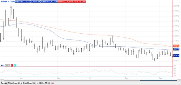 Prices were down $.04 – $.06 today.  Ag. markets were today pressured by Argentina’s announced economic policy changes and growing confidence in a more favorable long range forecast in South America.  The Argentina Govt. plans to slash government spending, reduce energy and transportation subsidies while devaluing the peso to 800 per US $$, from the current 365.  They also announced they’d work toward eliminating export taxes, something that may prove difficult as that would require a vote from Congress.  Resistance for Mch-24 rests just above the market at the 50 day MA at $4.92 ½, followed by the 100 day MA at $4.99.  Support is at the Nov-23 low at $4.70.  No export announcements today.  Ethanol production slipped to 1,074 tbd last week, above expectations and well above the pace needed to reach the USDA usage forecast of 5.325 bil. bu.  Given the recent uptick in production with a decision on corn based ethanol possibly qualifying for tax subsidies for SAF later this week, bulls remain hopeful for higher corn usage heading into 2024 despite the recent margin pullback.  Gasoline consumption rose 4.6% last week to 8.859 mil. barrels per day, and was up 7.3% YOY.  Before eliminating export taxes there is the potential for Argentina to raise their export tax on grains to 15% from the current 12%.  Brazil’s corn exports are seen reaching 7.14 mmt in Dec-23, down from 7.4 mmt in Nov-23 however a record high for the month.  Since July 1st Ukraine has exported 7.4 mmt of corn, down 32% from YA.  Export sales tomorrow are expected to range from 30 – 65 mil. bu.