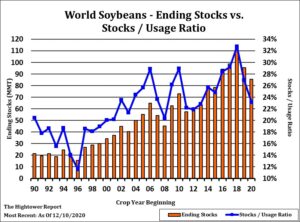 March soybean tested 11.89 on new concerns about 2021 South America soybean supplies. Some talk that near record low World soybean to stocks ratio calls for higher soybean prices is also supportive. US farmers have sold as much as 80-85 pct of the 2020 crop which limits new selling above the market. One crop analyst estimates the Brazil soybean crop at 130 mmt with a range of 123-132. They estimate Argentina soybean crop near 48 mmt with a range of 44-48. USDA estimates Brazil soybean crop near 133 and Argentina 50. Another group sees the Argentina soybean crop near 128 mmt. These groups estimate that it is just a matter of time before higher prices reflect lower South America supply, higher US exports than USDA guess and lower carryout. Some feel and objective of March soybeans could be 13.00-14.00. Record US soybean export and crush to date also supports prices.