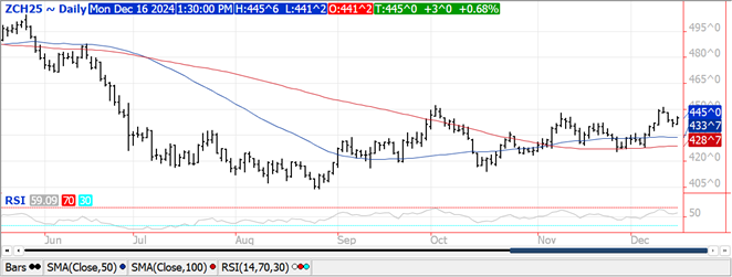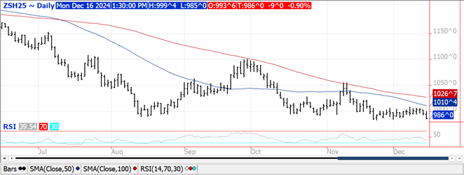 Prices are up $.02-$.03 as spreads also firmed.  Resistance for Mch-25 rests at LW’s high at $4.51 ¼, which is a penny below the Nov-24 high.  South American weather remains mostly favorable with a good mix of rain and sunshine thru year end for much of Brazil.  Conditions however are dryer across Argentina.  There are several chances for scattered showers over the next week to 10 days however coverage is expected to favor the central and northern growing areas.  Dry pockets and crop stress may begin to develop over some of the southern growing areas, particularly in Buenos Aires.  Money managers last week were net buyers of nearly 78k contracts, extending their long position to nearly 166k, their largest position since Feb-2023.  Index funds are also holding their largest position in corn since Feb-23 at nearly 346k contracts.  Export inspections at 44.5 mil. bu. were an 11 week high and in line with expectations however below the 52 mil. bu. needed per week to reach the revised USDA export forecast of 2.475 bil. bu.  YTD inspections at 524 mil. are up 31% from YA vs. the USDA forecast of up 8%.  Noted buyers were Mexico – 15 mil. and Japan – 8 mil.  AgRural is forecasting Brazilian corn production at 121.3 mmt, well below the USDA est. of 127 mmt.