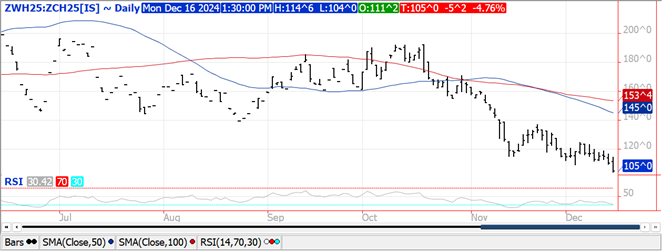 Prices closed mixed with Chicago steady to $.02 lower KC and MGEX held steady to $.02 higher.  Mch-25 Chicago wheat premium to Mch-25 corn fell to a fresh low today at $1.05 per bu.  Export inspections at 11 mil. bu. were in line with expectations however below the 16 mil. needed per week to reach the revised USDA forecast of 850 mil. bu.  YTD inspections at 424 mil. are up 29% from YA, vs. the USDA forecast of up 20%.  Last week MM’s were net buyers of just over 2,600 Chicago wheat, nearly 2k in KC and just over 1K in MGEX.  Saudi Arabia reportedly purchased 804k mt of hard wheat in their recent tender ranging from $262.50 mt to $269.89 mt CF.  The grain was sourced from Romania, Bulgaria, South America and a few cargoes from Russia.  Shipment is expected between Feb-25 thru April-25.  Russian backed Chechnya leader Kadyrov said he’d work with Syria’s new Govt. leaders to ensure they receive shipments of Russian wheat that were suspended LW over payment and other logistical issues.