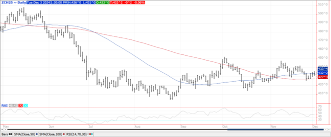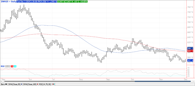 Prices eased into the close settling steady to $.02 higher across all 3 classes. Mch-25 Chicago and MGEX continue to hold support above their August contract lows. KC Mch-25 made a new low yesterday. Crop ratings in Kansas did improve 1% to 56% G/E vs. only 40% YA. Last week MM’s were net sellers of 7.6k Chicago, 1.3k KC and just a couple hundred MGEX wheat. The combined MM net short position in wheat has grown to 120k contracts, the largest in 4 months, however so far lacks the spark to ignite a short covering rally. Jordan didn’t purchase any wheat in their recent 120k mt tender. Russian wheat conditions show 37% of the crop is rated poor, the worst ratings in a decade making the crop more vulnerable to winter kill if conditions turn harsh this winter. Above normal precipitation in SE Australia will likely slow harvest and possibly raise wheat quality concerns. EU 24/25 soft wheat exports as of Dec. 1st have reached 9.48 mmt, down 31% from YA.