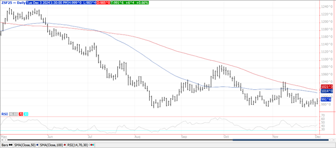 Prices were higher across the complex with beans up $.04-$.06, meal was $2-$3 higher while oil was up 60-70. Spreads were steady to firmer across the complex as well. Jan-25 beans stalled at $9.99 and remain stuck between $9.75-$10. Next resistance not until the 50 day MA at $10.14. So far Jan-25 bean oil stalled near its 100 day MA resistance at 42.46. Inside trade for Jan-25 meal as it consolidates near $290 per ton. Census crush in Oct-24 at nearly 216 mil. bu. was above expectations and a new record high. Production was up 16% from Sept-24 and 7% YOY. In the first 2 months of the 24/25 MY crush has reached a record 402 mil. bu. up 7% from YA vs. the USDA forecast of up 5.4%. Despite the higher than expected crush, bean oil stocks fell to 1.486 bil. bu. down from 1.501 bil. last month vs. expectations for a mild build. Stocks at the end of Oct were the lowest in over a decade. Spot board crush margins improved $.07 to $1.10 ¾ bu. with bean oil PV rebounding to 42%. Recent rains across key growing areas of Argentina have helped restore subsoil moisture. Although a dryer trend is expected over the next week to 10 days, this will enable farmers to advance corn and soybean plantings and wheat harvest. In Southern Brazil and Paraguay too much rain over the next week may produce localized flooding. Conditions across central and northern regions of Brazil remain favorable. MM’s were net sellers across the complex selling nearly 14k beans, 33k bean oil and 12k meal. Their short position in meal has swelled to over 75k contracts and within 2k of its record large short. EU 24/25 soybean imports as of Dec. 1st have reached 5.46 mmt, up 12.3% from YA. Meal imports at 8.15 mmt are up 28.5%.
