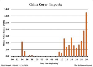 Corn futures traded higher. Early trade was lower on C Brazil rains, lack of new US corn sales to China and concern over increase US and World Covid cases could force additional shutdowns and a continued slowdown in food and fuel demand. Better than expected weekly US soybean exports offered support to prices near session lows. Managed funds are buyers of 12,000 corn. We estimate Managed Money net long 283,000 Corn. Weekly US corn exports were near 29 mil bu versus 19 last year. Season to date exports are near 434 mil bu vs 257 last year. USDA goal is 2,650 vs 1,778 last year. Some are as high as 3,000. One group est US 2020/21 corn carryout near 1,542. Dec 1 stocks 12,045 vs 11,327 ly. Dec-Feb use a record 8,266 versus 7,951 ly. Exports 465 vs 270 ly. Mar-May use 3,687 vs 2,942 last year. Exports 672 vs 355 ly. US China corn exports 815 vs 80 ly. Last week, Informa est World corn crop near 1,137 mmt versus 1,117 last year. Informa dropped EU crop 2 mmt to 60 vs 66 last year. Informa est World 2021 corn crop near 1,179 mmt. Talk of drier than normal S Brazil and Argentina weather should help push corn futures higher.