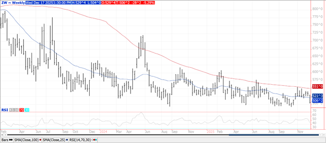 Prices ranged from $.03 lower in CGO and MIAX to $.03 higher in KC. Spreads have also weakened in CGO while steady to firm in KC. New contract lows for spot CGO and MIAX. The USDA confirmed the cancellation of 132k mt of white wheat sold to China. That sale held on the books for not even a month. While the USDA will likely show a reduction in US winter wheat acres next month, it has done little to support prices in the face of rising global production and stocks. Question becomes, how low is low. Support for Mch-26 CGO is at $4.92, the fall low on the spot weekly chart. CGO Mch-26 spread over corn has fallen to a new low of $.66 bu. as it tries to work into feed rations. Mch-26 KC rests just above its contract low at $4.98 ¾. Expectations for expanded drought reading across the US southern plains in tomorrow’s US drought monitor update likely the cause for support in KC futures.