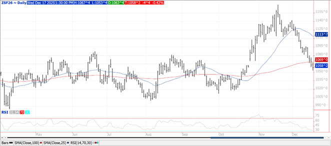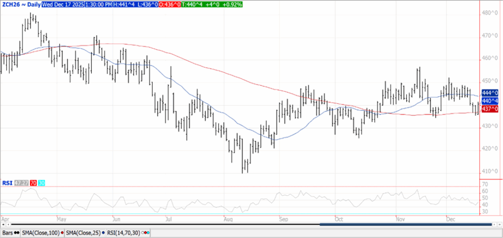 Prices were $.01-$.04 higher as corn was able to separate from weakness in the soy complex. Spreads also firmed. Mch-26 close back above its 100 day MA and above yesterday’s high. The $4.35-$4.55 range remains intact. The USDA announced the sale of 177k mt (7 mil. bu.) of corn to Mexico. Ethanol production jumped to 332.5 mil. gallons LW, up from 325 mil. the previous week and a new all-time high. Production was well above expectations and above the pace needed to reach the USDA corn usage forecast of 5.60 bil. bu. Despite the higher than expected production, ethanol stocks slipped to 22.4 mil. barrels, below expectations at below the 22.6 mb from YA. Implied gasoline usage surged 7.4% to 9.078 mbd, and was up 1.7% YOY. COF after the close on Friday is expected to show cattle inventories down 1.7% from YA, as they continue to hold 1-2% below last year. Despite this the USDA feed usage forecast of 6.1 bil. bu. is up 11.6% from YA. A South Korean feed group reportedly bought 268k mt of feed corn around $254/mt CF.