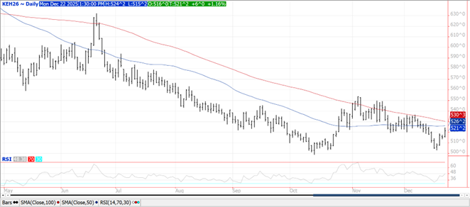 Prices ranged from $.02-$.06 higher across the 3 classes.  Heightened tensions in the Black Sea region along with off the coast of Venezuela fueled the injection of war premium.  CGO and KC futures were the leaders to the upside.  For the week ended Dec. 9th MM’s sold just over 2k contracts of CGO futures while lite buyers in both KC and MIAX.  The combined short position across the 3 classes holds at just over 80k contracts.  Export sales week ended Dec. 4th at 14 mil. bu. brought YTD commitments to 710 mil. bu. up 23% from YA, vs. the USDA forecast of up 9%.  Export inspections at 23 mil. bu. were above expectations and above the 15.5 mil. bu. needed per week to reach the USDA forecast.  YTD inspections at 542 mil. bu. are up 23% YOY.  A South Korean feed group reportedly bought 65k mt of feed wheat at $253/mt CF for June shipment.  Algeria is seeking 50k mt of durum in a tender that closes Tues. or Wed.