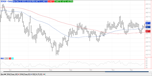 Prices were $.02-$.03 higher with spreads slightly firmer.  Mch-26 futures traded above LW’s highs however remain in a $4.35-$4.55 range.  MM’s sold just over 13,500 contracts in the week ended Dec. 9th cutting their long position to just under 10k contract. Export sales for the week ended Dec. 4th at 58 mil. bu. brought YTD commitments to 1.804 bil. bu. up 30% from YA, vs. the USDA forecast of up 12%.  Export inspections at 69 mil. bu. were in line expectations and above the 61 mil. needed per week to reach the USDA forecast.  YTD inspections at 955 mil. are up 68% from YA.  Noted buyers were Mexico – 21 mil., Korea – 16 mil. while Japan and Spain took 9-10 mil. each.  Friday’s COF data showed cattle numbers down 2% from YA, however placements at 11% below YA vs. expectations of down only 8%.  The USDA’s feed usage forecast at 6.1 bil. bu. up 11.6% YOY, is at least 100-200 mil. bu. too high.  US exports likely to remain strong with US competitively prices into 2nd Qtr. of 2026.