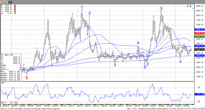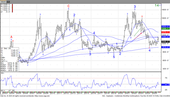 SH is near 10.61. This week, SH failed to push above resistance near 10.80 which triggered increase profit taking. Private estimates of US 25/26 soybean carryout is near 400 mil bu vs USDA 290. Season to date exports are 565 mil vs 1,053 ly. Final US exports are est closer to 1,500 vs USDA 1,635. US soybean crush could be a record 2,575 mil bu vs 2,445 ly. Trade will be watching South America weather. South half of Argentina is dry. No rain is forecast for next 10 days. Brazil will see normal rains. On the monthly chart, nearby soybean futures had 3 peaks in 2008, 20112 and 2022 near 17.00. From 2015-2020 nearby soybean futures were near a 8.00 low. Assuming normal 2026 global weather, Nearby soybean futures should drop below 10.00.