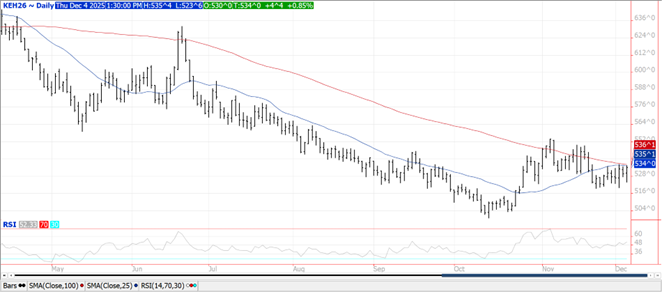 Prices ranged from $.03 lower in MIAX to $.05 higher in KC with all 3 classes experiencing 2 sided trade.  Mch-26 CGO has resistance at its 100 day MA at $5.44 ¾ while KC and MIAX Mch-26 contracts have both topped out at their respective 50 day MA’s.  Exports at 19 mil. bu. brought YTD commitments to 617 mil. bu. up 22% from YA, vs. the USDA forecast of up 9%.  Shipments as of Oct. 30th at 425 mil. bu. were up 23% YOY.  Algeria’s recent purchase topped out near 900k mt with the cost reportedly near $256/mt CF.  Nearly all is believed to have been sourced from the Black Sea region with most from Russia.  Thailand reportedly purchased 240k mt of optional origin feed wheat at just over $250/mt CF.  Stats Canada raised their 25/26 all wheat production est. 3.3 mmt to 39.95 mmt, above expectations and 11% above last year’s record crop.  By class production has spring wheat at 29.26 mmt, durum 7.14 and winter wheat 3.56.
