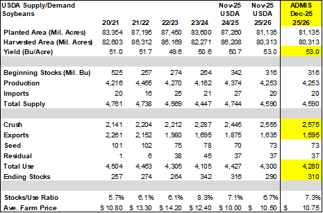Prices were mostly higher with beans up $.02-$.04, meal was mixed while oil was up 10-20 points.  Bean and oil spreads firmed while meal spreads were mixed.  Jan-26 beans rejected trade into new lows for the week with next resistance at the 50 day MA at $11.28.  Jan-26 meal closed well off session highs.  Jan-26 bean oil has support at its 50 day MA at 50.91 and resistance at the 100 day MA at 52.16.  There were zero deliveries against Dec-25 meal with 95 against Dec-25 oil.  While US Treasury Sec. Bessent insists China will buy 12 mmt of US soybeans by the end of Feb-26, there were once again no flash sales announced this AM by the USDA.  Announced sales since late Oct-25 to China remain at 2.25 mmt.  Meanwhile Chinese crushers continue to buy Brazil soybeans for Q1 2026 as their FOB offers remain roughly $.60 bu. below US offers.  Spot board crush margins slipped $.02 ½ to $1.35 bu. with bean oil PV holding at 45.4%.  Soybean exports at 46 mil. brought YTD commitments to 632 mil. bu. down 38% from YA vs. the current USDA forecast of down 13%.  The first sale of 232k mt (8.5 mil. bu.) to China showed up in this week’s data.  Shipments as of Oct. 30th at 278 mil. bu. are down 39% YOY.