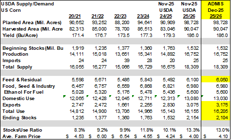 Prices were $.03-$.04 higher as the lower 1 day, up the next trend this week continues.  Spreads firmed.  Mch-26 futures are back above its 50 day MA while holding in a $4.35-$4.55 range.  Deliveries against Dec-25 held at 4 contracts.  Exports at 79 mil. bu. brought YTD sales to 1.471 bil. bu. up 31% from YA, vs. the USDA export forecast of up 9%.  Shipments as of Oct. 30th at 481 mil. were up 59% YOY.  Noted buyers that week were Mexico – 21 mil., Japan – 16.5 mil. and Korea with 14 mil.  In addition the USDA announced fresh sales of 101k (4 mil. bu.) of corn to Colombia and 392.5k mt (15.5 mil.) to Mexico.