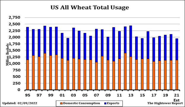 Corn futures ended higher. Corn futures followed higher soymeal and Crude oil prices. Weekly US ethanol production was up 1 pct from last week and up 10 pct from last year. Stocks were up 2 pct from last week and up 5 pct from last year. Margins remain negative. Argentina corn crop could drop below 48 mmt and Brazil below 110.0. Ukraine may not be able to export 17 mmt (670 mil bu) if Russia invades Ukraine. Most of Ukraine corn goes to China, EU and N Africa. China may have asked Russia to delay an invasion so they can get the corn they need first. Where does the World get 1,570-1,650 mil bu corn if South America crops are down 36-37 mmt? Domestic Brazil corn prices are near $8. Brazil farmer is not selling corn. Weekly US corn export sales are estimated at 500-1,000 mt versus 589 last week. CK tested Tuesdays low near 6.35 before closing near 6.45. First resistance is near 6.54 then 6.60. Support is near 6.30. Bulls still feel a shift in demand should push CK to new highs, Some feel CK may need to test 7.00 to reflect lower South America supplies, potential drop in Ukraine exports if Russia invades Ukraine and futures need to ration demand before US 2022 corn harvest. There remains concern that US farmers may plant 91.0 million corn acres in 2022 versus 93.4 last year, trend yield could limit US 2022/23 corn carryout to 1,100 mil bu if demand is near 15,035 versus USDA 2021/22 demand of 14,835. Some could see US 2021/22 corn demand closer to 15,155 and carryout near 1,220 versus USDA 1,540.
