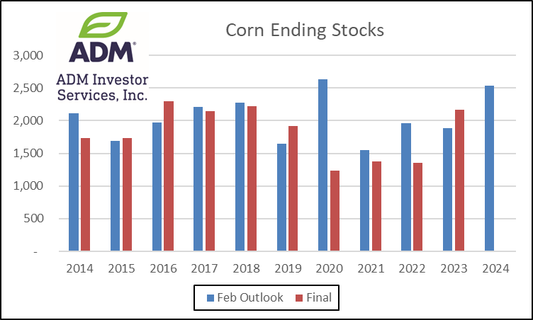 Prices were lower across all 3 classes at today with new contract lows for KC and MGEX. Today’s low for Mch-24 Chicago at $5.56 ¾ held just above contract lows at $5.56 ¼. Despite the recent selloff, US still finds itself $25 – $30/mt above offers from Russia and the Black Sea. Russia’s Ag. Ministry lowered their wheat export tax 2.6% to 3,953 roubles/mt for the period ending Feb. 27th. Little to no rain for the US plain states and WCB over the next week. Temperatures are expected to warm to much above normal readings the last week to 10 days of February for most of the nation’s midsection. Spreads in Chicago continue to firm as exporters are forced to pay up to pry SRW wheat away tightfisted farmers/elevators perhaps needing to start shipments to China. Yesterday’s export sales report showed there are still 60 mil. bu. of outstanding wheat sales to China, with 55 mil. of that SRW. Another 8 mil. SRW are in unknown. IKAR raised their Russian grain production forecast for 2024 to 146 mmt, with 93 mmt of wheat. Their forecast is in line with the 93.6 mmt from SovEcon earlier in the week and just above the USDA forecast of 91 mmt. IKAR also raised their wheat export forecast to 52 mmt, just above the USDA est. of 51 mmt. History shows the USDA has a strong tendency to underestimate stocks in the February Outlook. 8 of the past 10 years stocks finished higher than the initial forecast.