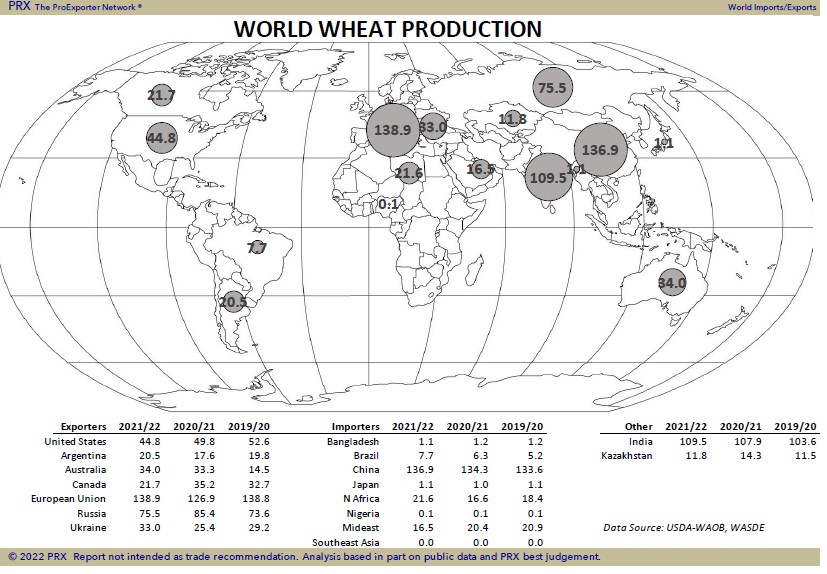 Wheat futures ended higher. Trade may be putting on a Russia/Ukraine tension premium into the long holiday weekend. CBOT grains are closed Monday due to holiday. Weekly US export sales were only 118 mt. Total commit is 17.4 mmt vs 23.4 ly. USDA goal is 22.0 vs 27.0 ly. USDA estimates World wheat crop at 776 mmt vs 775 ly. Of the total, EU is 139, China 137, India 109, Russia 75, US 44, Australia 34 and Canada 21. Total domestic demand is 788 mmt with China 147, EU 107. India 104, N Africa 48,Middle East 40, US 30 and SE Asia 25. World exports are 206 mmt vs 202 ly. EU 37, Russia 35, Ukraine 24, Australia 25 and US 22. Some feel combined EU, Russia and Ukraine exports could be down 10-12 mmt from USDA estimate. You can see how important EU and Black Sea exports are. Major imports are N Africa 29 mmt, SE Asia 26 mmt and Middle East 24. NOAA 30 and 90 day US south plains forecast calls for below rains and above temperatures.