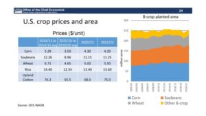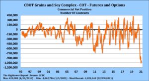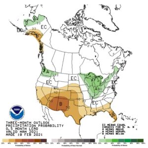 Corn futures traded lower. CK range was 5.46-5.52. Next support is Wednesdays low near 5.44 then the 20 day moving average near 5.40. Frigid cold weather is slowing cash movement and reducing commercial buying. USDA Chief Economist estimated US 2021 corn acres at 92.0 million versus 92.9 million expected and 90.8 last year. USDA est US 2021/22 on farm corn prices near 4.20 versus 4.30 this year. On Friday, USDA will issue new US 2021/22 supply and demands. Trade expects the 2021 US corn crop near 15,243 mil bu and US 2021/22 corn carryout near 1,725 mil bu versus 1,502 this year. Guesses for this weeks US corn export sales is 800-1,200 mt versus 1,440 last week. Weekly ethanol production was down from last week and last year. Stocks were up from last week but down from last year. Margins remain negative. There is some new concern about a drier south Brazil and Argentina 2 week weather forecast. Rains in north Brazil could slow corn plantings there. NOAA US 30 day and 90 day weather forecast calls for normal above temps from much of the US. Rainfall is below normal across the southwest with above normal rains in the Great Lakes.