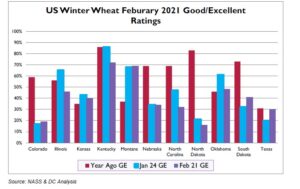 Soybeans traded higher. Talk of concern about Brazil and Argentina 2021 crops offered support. New technical buying rallied prices over 14.00 SK. Some look for soybean prices to be in for more of a roller coaster ride now. Prices could be supported into USDA March 9 supply and demand report and March 31 acreage and stocks report. Prices could then find resistance if US 2021 planting season is normal and South America improves on exports. Then prices could begin to add some premium into US summer growing season. Need for US farmers to plant 90 million soybean acres and a near record yield to get a US 2021/22 carryout near USDA 145 could support prices. Brazil soybean harvest Is near 15 pct done with concern about early yields and disease. Higher highs in China vegoil contracts and Malaysian palmoil futures pushed BOK over 48 cents. Talk that EPA may not offer waivers to refiners for biofuels also supported prices.