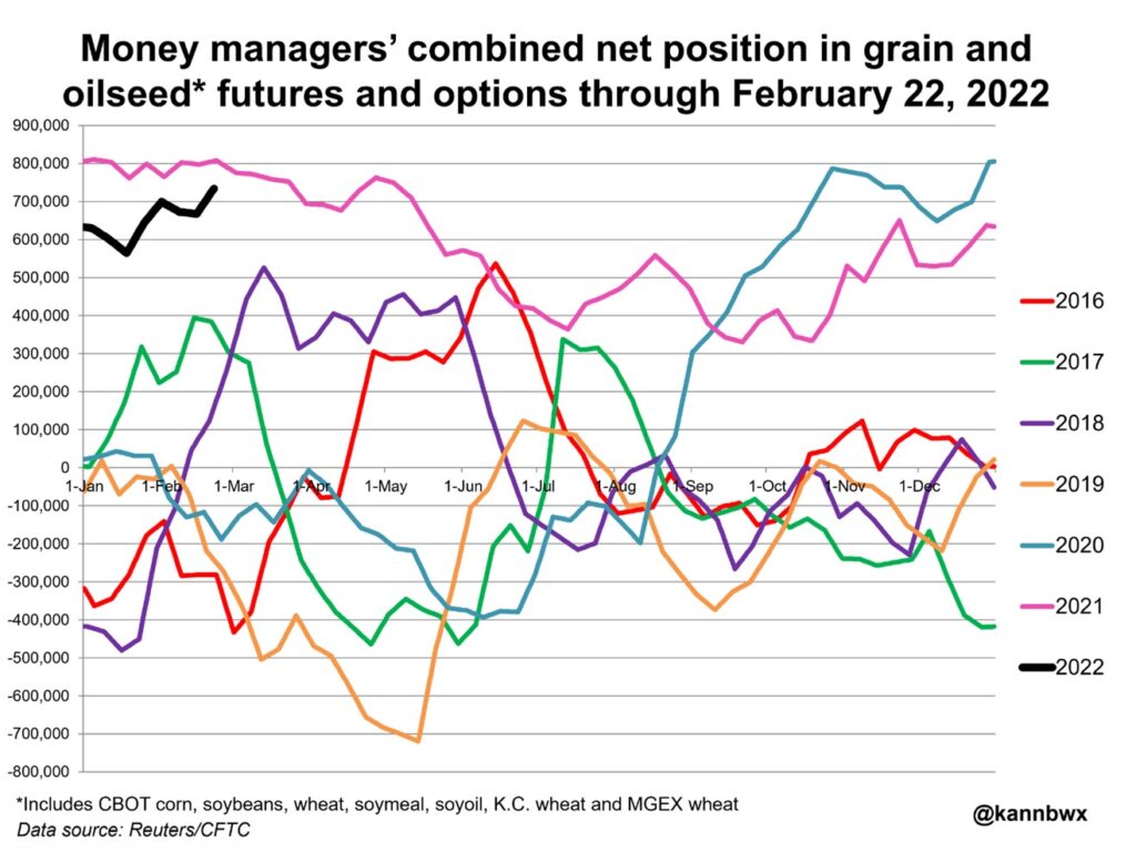 Soybean price volatility was unprecedented over the last 2 days. Russia invasion of Ukraine triggered a rally to near 17.59 SK. Talk today of China requesting Russia to seek peace talks with Ukraine and fact Funds were disappointed that US did not sanction Russia food and energy companies sent SK down to 15.79. Crude oil range was 98.44 to 88.49. Weekly US soybean export sales were near 45.3 mil bu. Total commit is near 1,812 mil bu vs 2,195 last year (-383). USDA goal is 2,050 vs 2,261 ly (-211). Since November, USDA has lowered South America soybean crop 735 mil bu and increased US soybean exports only 10. USDA estimated US 2022/23 soybean carryout at 305 mil bu versus most private estimates near 100. This also triggered fund liquidation of long SX22 positions.
