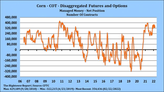 May corn ended the day up the daily limit. News of Russia invading Ukraine sent CK to 7.16. Concern that Russia would take over Ukraine quickly send CK down to near 6.51. CK ended today near 6.90. The synthetic market was near 6.96-6.98. The US and its allies moved to block certain Russian banks access to the SWIFT payment system. The bid to exclude from the trading system whole chunks of the world’s 11th largest economy and supplier of one-sixth of all commodities has no precedent in the globalized age. Russia continues to invade Ukraine. Ukraine continues to fight. Large Russia military force is heading for Ukraine capital. There is talk that Russia grain export ports are closed. There is also talk that Ukraine grain ports are mined and closed. Some open Black Sea grain sales are being washed out. There is also talk of some Ukraine corn sales being switched to US. Peace talks ended with no resolution. Weekly US corn exports were near 60.2 mil bu versus 80.5 last year. Season to date exports are near 913 mil bu vs 1,033 last year. USDA goal is 2,425 vs 2,753 ly. Trade estimates US 2021/22 corn carryout near 1,250 versus USDA 1,540. Some doubt Ukraine will ship 590 mil bu of corn and South America crops could be down 510 mil bu from USDA.