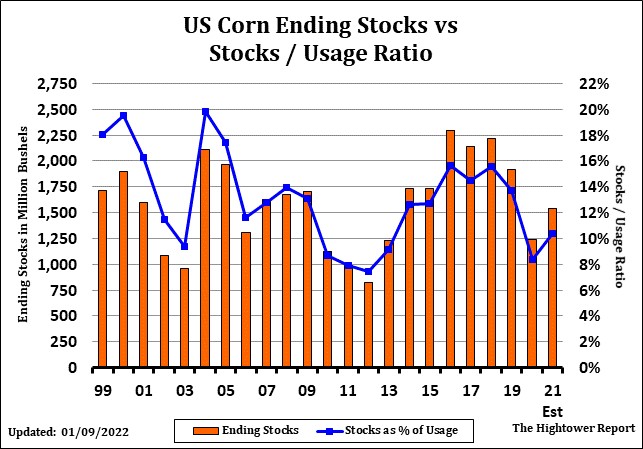 Corn futures ended lower. Managed funds turned sellers after Wednesday higher than expected weekly US ethanol stocks and drop in margins. Most feel supplies will drop once spring and summer driving increase. Corn selling increased after US China Ag attaché dropped their estimate of China 2021/22 corn imports to 20 mmt vs USDA 26. More selling was triggered by USDA announcing China had cancelled 380 mt US corn. Some feel this could be a mistake and could be new soybean sales. Weekly US corn sales were 1,175 mt. Total commit is 45.1 mmt vs 58.5 ly. China commit is near 12.4 mmt. If US Ag attaché is right, US exports are 12 mmt. Ukraine has shipped 7-12 mmt. This suggest China imports are 19-24 mmt or they could be done buying US. Trade estimates Brazil corn crop at 113.6 vs USDA 115 and Argentina at 52.1 vs USDA 54.0. This is only 4 mmt drop. Some could see Brazil closer to 106 and Argentina closer to 40. That would be a 23 mmt drop. The large drop could increase demand for US corn exports. I t could also drop, US 2021/22 corn carryout dangerously low and could prompt a rally in corn prices to encourage US farmers to add acres. Trade estimates US 2021/22 corn carryout at 1,512 mil bu vs USDA January estimate if 1,540.some in the trade are as low as 1,200.